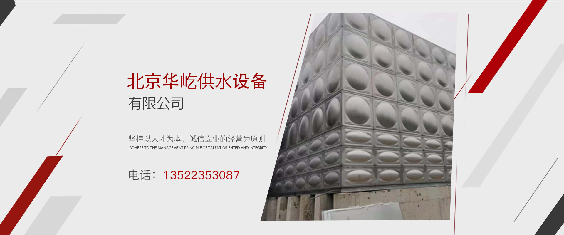 主營產(chǎn)品有不銹鋼水箱、玻璃鋼水箱、搪瓷鋼板水箱、無負壓供水設(shè)備、恒壓供水設(shè)備、消防供水設(shè)備、水處理設(shè)備,供水設(shè)備改造和設(shè)備保養(yǎng)服務(wù)。